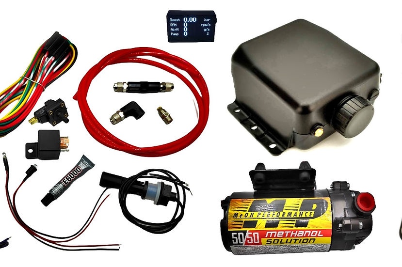 Include: -300 Psi Waterproof Pump 20GPH (1260cc per minute @ 190PSI) With Rubber Mounting. -Obd Controler With Map Sensor -3 Quart Tank(2.84lt) With Brass Vent.Plastic screw on cap Mounting hardware. -Side Tank Level Indicator. -Low Level Sensor With Led Indicator. -2 x Full Flow 3/8 NPT to 1/4In. Od Tub Pump Fittings. -1 x Full Flow 1/4 NPT Elbow Fitting. -6 Meter of High Temp Nylon Tubing Red or Black. -High Flow 7Psi Water-Methanol Check Valve With 1/8In. NPT to 1/4In. Od Tube Quick-Connect Fittings. -Full Flow 90 Degree or Straight Nozzle Holder With 1/8In. NPT to 1/4In. Od Tube Quick-Connect Fittings. -Water-Methanol Nozzle. -E6000 Sealant. -1 Meter Boost Hose.