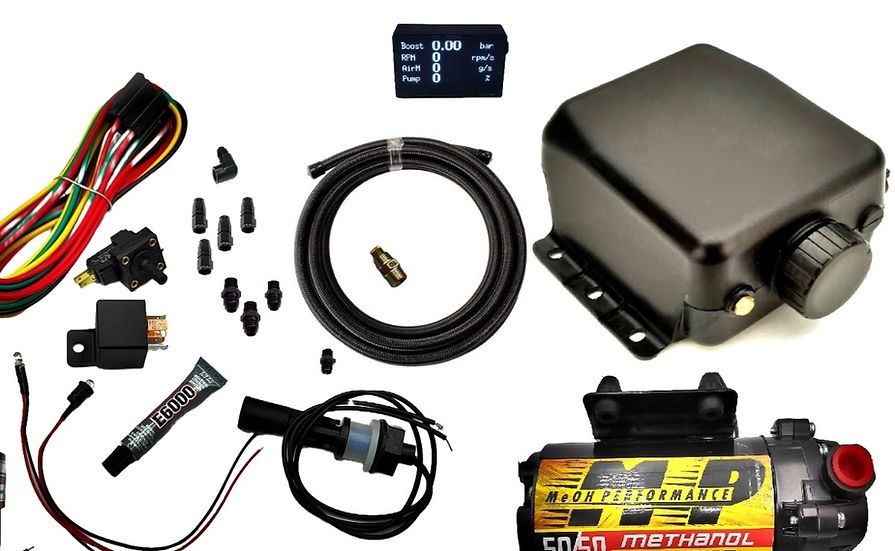 Include: -300 Psi Waterproof Pump 20GPH (1260cc per minute @ 190PSI) With Rubber Mounting. -3 Quart Tank(2.84lt) With Brass Vent.Plastic screw on cap Mounting hardware. -Obd Controler With Map Sensor -Side Tank Level Indicator. -Low Level Sensor With Led Indicator. -5 Wire Relay With Harness -6 Meter Braided Lines 4AN With Fittings. -High Flow Water-Methanol Check Valve With 4AN Fittings. -Full Flow 90 Degree or Straight Nozzle Holder With 4AN Fittings. -Water-Methanol Nozzle. -E6000 Sealant. -1 Meter Boost Hose.